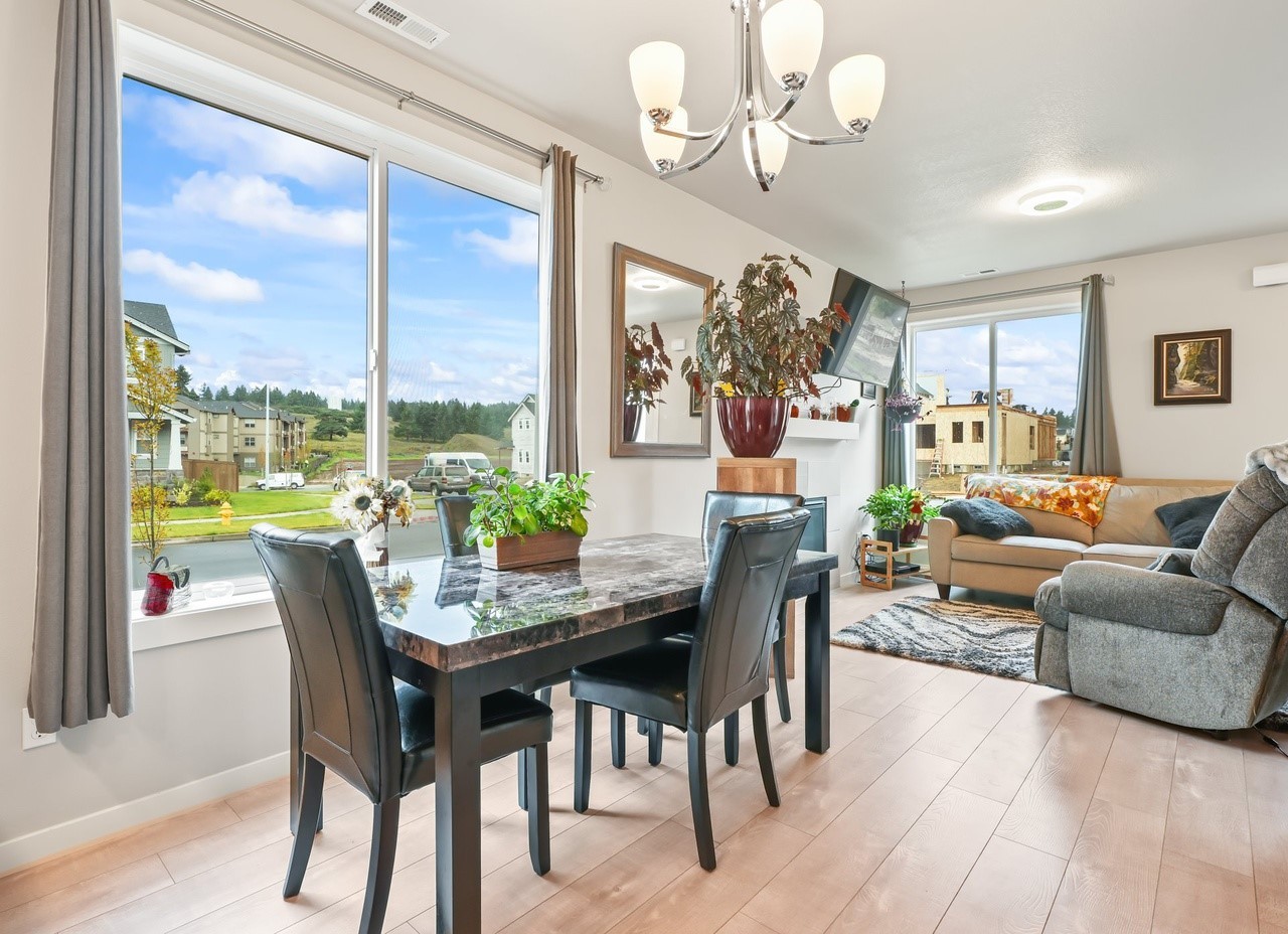 The modern U-shaped kitchen is a standout feature in this home, offering plenty of countertop space, modern cabinetry, and an intuitive layout that encourages both entertaining and daily function. Direct sight lines from the kitchen to the living and dining areas enhance the sense of volume and connection. Generous windows invite natural light deep into the home, enhancing the warmth and livability of the space.