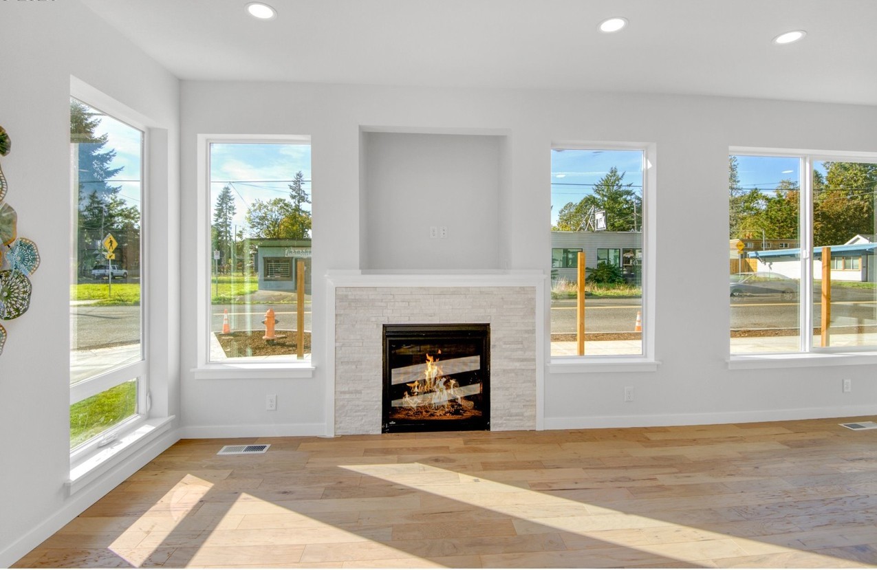 As you head to the upper floor, you’ll arrive at the third bedroom, along with a hallway that gives access to the utility closet on the left, the second bedroom, a full bath, and, last but not least, the master suite. We’ve created a master bedroom that gets a boatload of natural light from the front of the home. A total of 5 windows on the front and side of the home make your master suite light and inviting. The master bathroom has all the necessary trappings: a private toilet, his and hers sinks, and a full size shower and a walk-in closet much bigger than is usually found in a skinny modern home of this size.