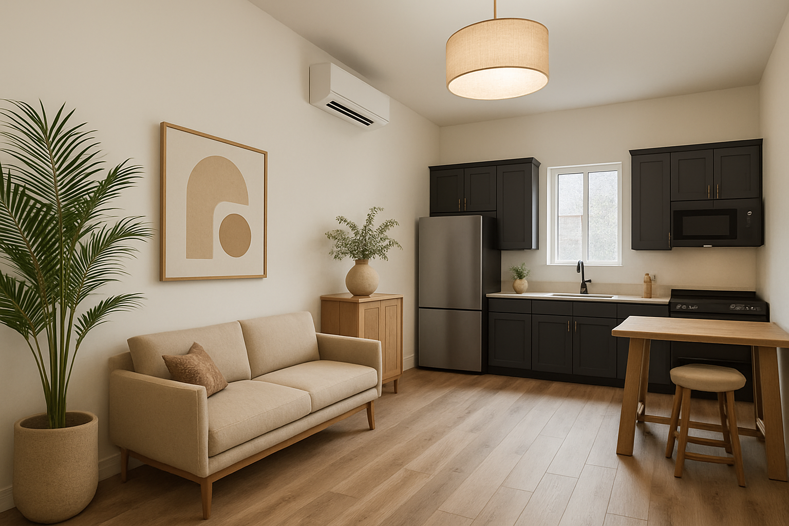 Basica Urban’s kitchen proves that small can still mean complete. Full-size appliances and a generous counter give you room to cook comfortably. Smart storage keeps the space tidy while maintaining a sleek, modern appearance.