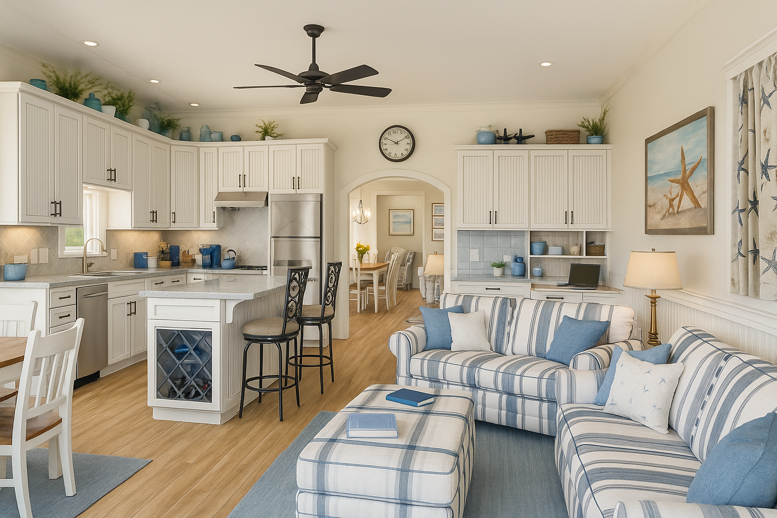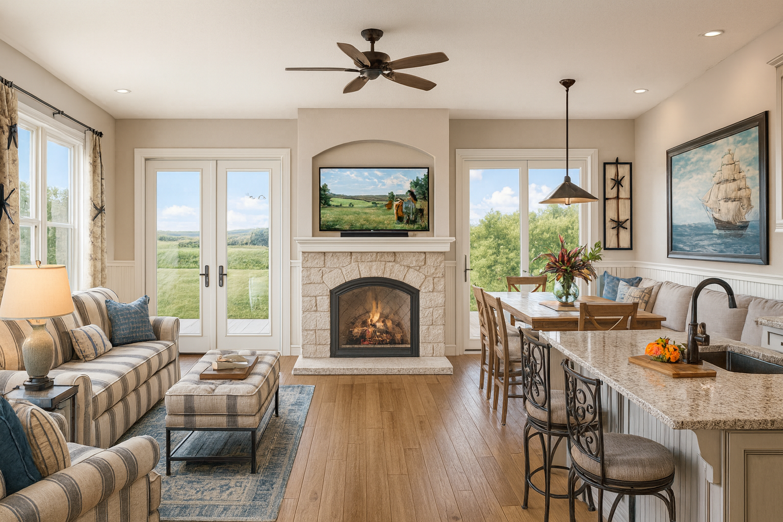 Step inside, and you’ll immediately notice the open layout that defines this Best Selling Tiny Home. The great room, dining area, and kitchen share one connected space, filled with natural light from the expansive front windows.
