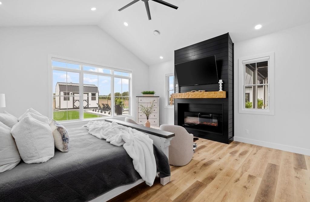 The master suite is designed with luxury in mind, featuring ample natural light through numerous windows and a vaulted ceiling that enhances the spacious feel. The master bathroom includes a wet room, double sinks, a separate toilet area, and one of the most expansive walk-in closets we offer. Also on this side of the home are a walk-in pantry with garage access and a utility room with exterior access.