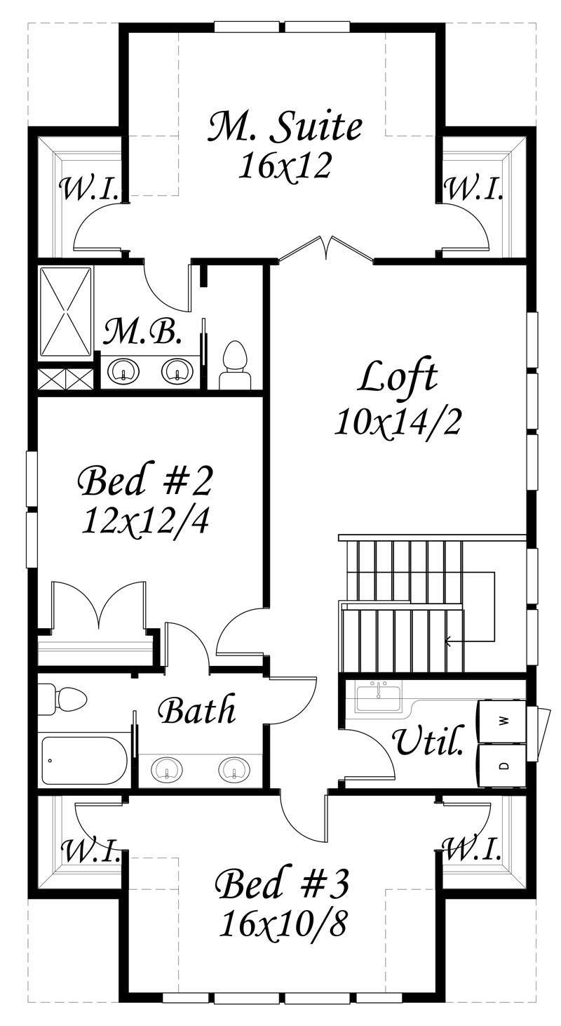 Moving to the upper floor, you’ll see what makes this home truly unique. We’ve placed the master suite at the rear of the upper floor, and packed it with some delightful amenities. The en suite bathroom includes the features of a much larger master bath, including his and hers sinks and a private toilet accessed via a pocket door to conserve space. There are two walk in closets situated on opposite sides of the room so no one has to step over each other when getting ready. Opposite the master on the other end of the home is a similarly shaped bedroom with matching walk-in closets. Between these two bedrooms is a third bedroom that includes direct access to the second upstairs bathroom.