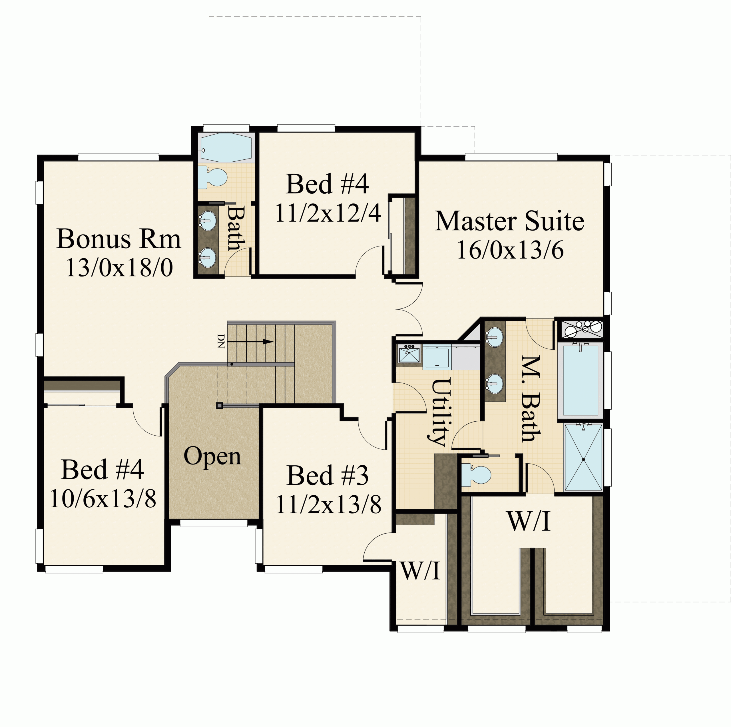 Finishing off the main floor is one of two master suites, perfect for an older child that needs a private space. The upstairs is where you’ll find the bulk of the bedrooms, as well as a deluxe utility room and spacious bonus room. Entering the upstairs will place the you right at the bonus room, which offers tons of natural light thanks to its location at the left rear corner. Walking either direction will take you to bedrooms, with one to the left and three to the right. The parents will get a deluxe master suite that occupies the entire right wing of the upper floor; here you’ll see the lavish master bath and gigantic walk in closet. The shape of this closet allows for easy access to either side while providing clear separation for easy organization. Not to miss is the large utility room with direct access via both the master bath and the hallway to the third bedroom.
