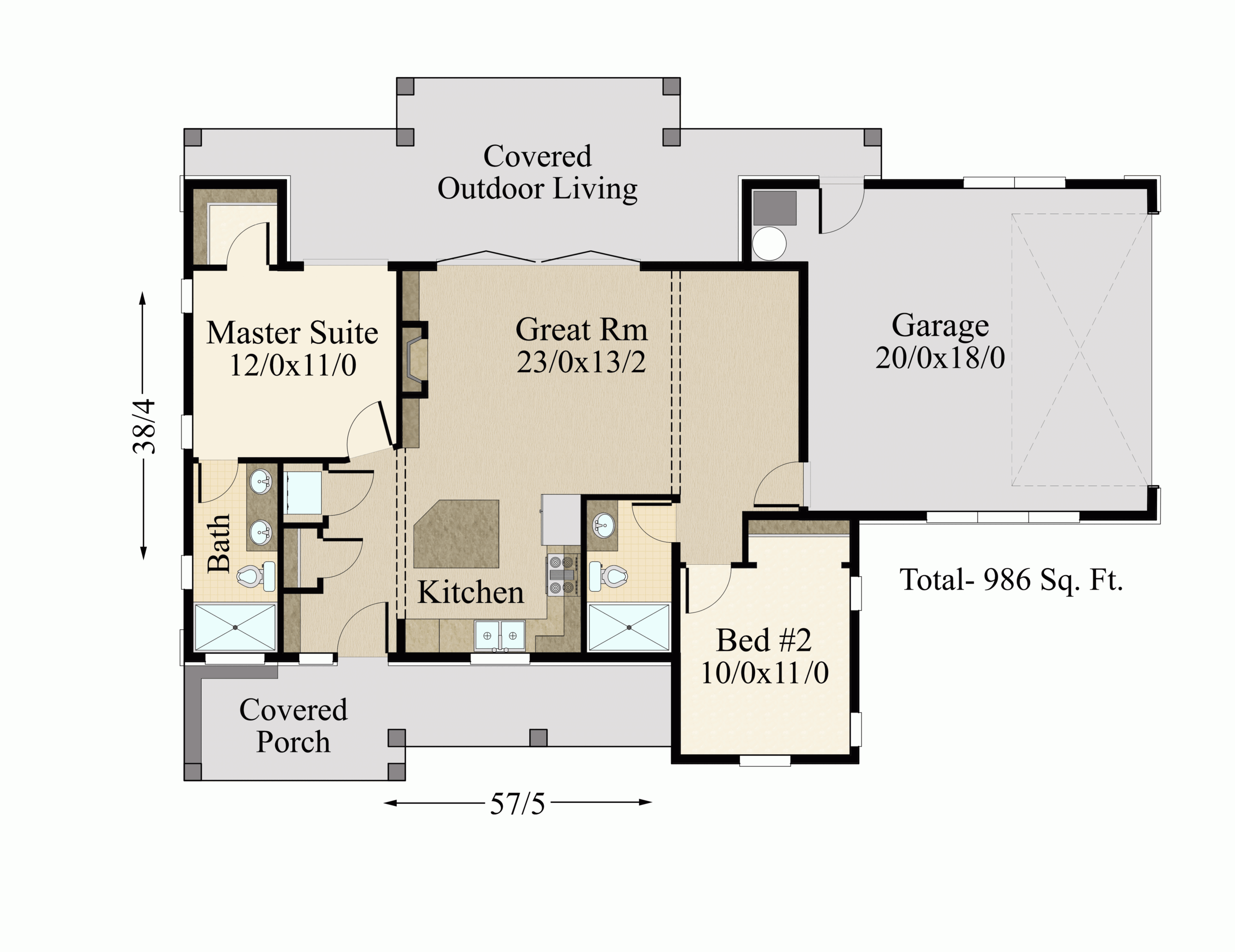 For the family that wants the modern farmhouse style in a small package, we can hardly think of a better option than Farm 640. At just under 1000 square feet, you’ll find you have everything you need and nothing you don’t. There are two covered outdoor spaces, one at the front, one at the rear, making this home work beautifully on a lot with views in either direction. The bedrooms are positioned at either end of the home, offering far more privacy than most other homes in this size range. Another feature not often found on a home under 1000 square feet is the two car garage. This allows you to downsize your home without having to worry about parking on the street. For those that like this floor plan but are seeking a modern exterior, take a look a our plan Diamond Back.