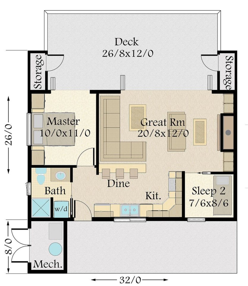 For those looking to really scale down, Jupiter offers a stylish and comfortable solution. At 640 square feet, we’ve been able to pack in a lot of functionality and flexibility while keeping the space down. Starting at the kitchen, you’ll see there is ample counter and cabinet space, as well as a dining island as well as space for a more formal dining table beyond. The living room has been designed to function as two smaller gathering spaces, one large great room, or a smaller living room and formal dining area. The master bedroom lies just beyond the entry, and boasts tons of built in storage, closets, and enough room to comfortably fit a king sized bed. An additional sleeping area is included just off the great room to accommodate overnight guests. Rounding out the home is a beautiful covered outdoor living space, a feature often missing in house plans of this size.