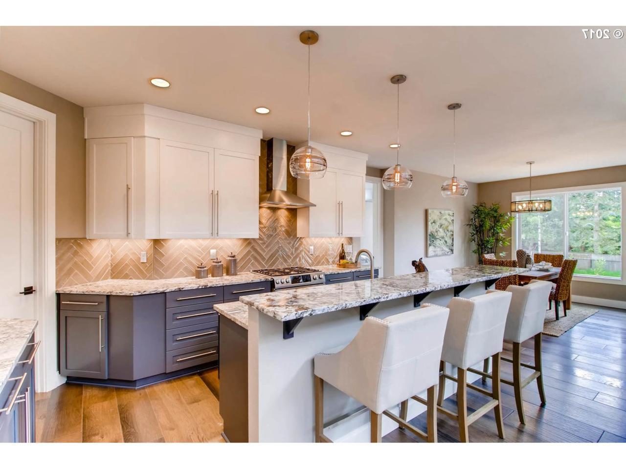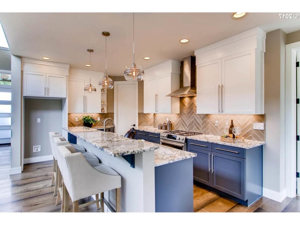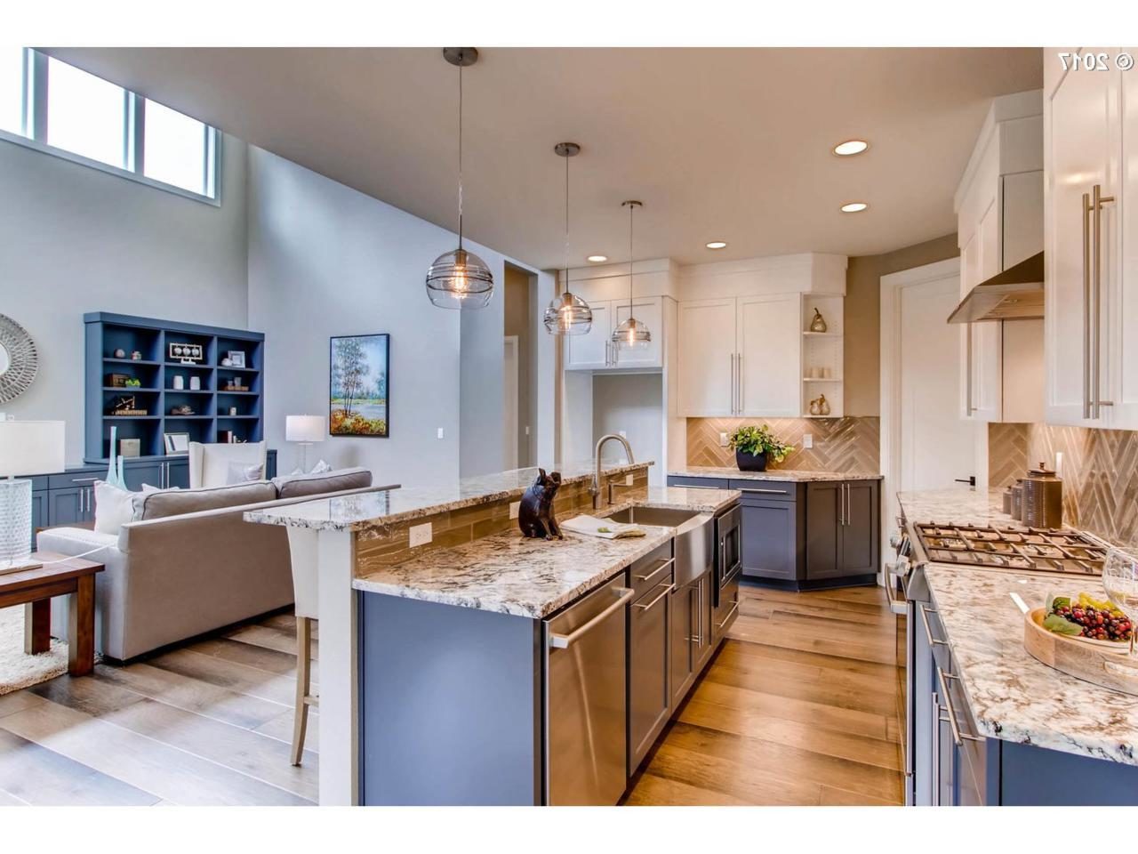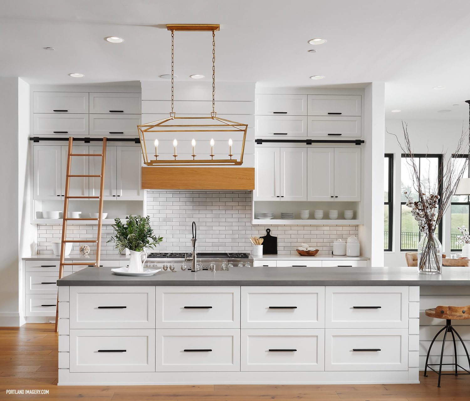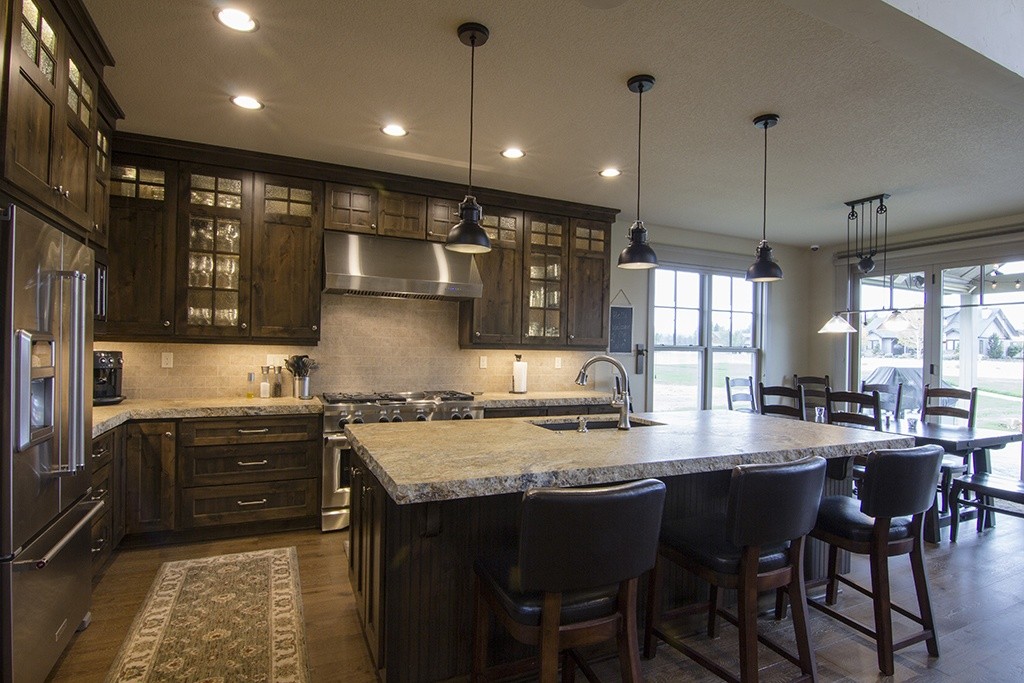 You’ll find many of the same principles at work in Modern Ridge, with a few extra surprises. The whole home centers around the beautiful gourmet kitchen shown above. A huge factor to consider when building a kitchen like this is what materials are used. With the kitchen taking such a central role in the livability and feel of the home, the finishes and materials become increasingly important. In a purely utilitarian kitchen, finishes are often ignored, but if you want a truly comfortable and beautiful social kitchen, the materials need to work with the greater design elements of the home. The island in this home includes a raised section to allow for casual dining as well as separating the prep space from the eating/work space. A lovely walk in pantry can be accessed via the back corner of the kitchen. This saves precious cabinet space and also provides an additional length of counter space as the rear counter bends to follow the wall.