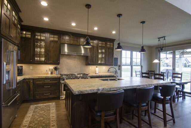 For decades the kitchen has been relegated to a small, often closed off, quadrant of the home. The kitchen was meant for food preparation, and nothing more. Now, take a look around. Tune into any home renovation show and watch what they do to the kitchen. Walls are knocked down, windows are added, islands are made bigger. The kitchen has become the new social nucleus of the home. Not only do we prepare food in our kitchens. We eat, we work, we plan, we visit. It is not enough to just build a bigger kitchen. They must provide a comfortable layout and greater integration with the spaces around them. Today we’re going to take a look at a few of our plans that show just what a modern kitchen looks like.